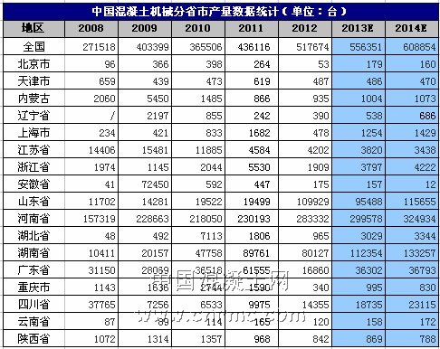 2011-2012年已進入更新換代的高峰期,混凝土機械市場在這兩年已達到快速發展的鼎盛時期。2012年起,我國泵車銷量整體增長趨緩,這也意味著存量的增長,增速開始放緩;2013年1-10月,我國混凝土機械的總銷量達433575臺,同比增長3.52%,預計今年的總體情況與去年持平,甚至有可能開始下滑,2014年如要想繼續保持這種強勁勢頭難度很大,但增速放緩并不意味著我國混凝土行業的發展受到阻滯。從上表可以看出,不少省市2013-2014年的混凝土機械數量將有可能出現負增長,主要原因在于2012年以前的混凝土機械市場發展過快,產量多導致產品更新換到受到阻滯,從2013年開始混凝土市場形成飽和局面,存量增長導致增速放緩,但并不影響正在開工或即將開工的新建設項目,混凝土機械行業最大的發展機遇依然來自城鎮化建設,我國仍處于城鎮化加快發展的重要階段,到2020年中國的城鎮化率將提高到60%以上。城鎮化帶動基礎設施和房地產的建設,將產生持續的混凝土需求。