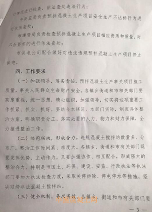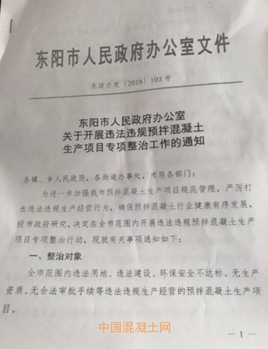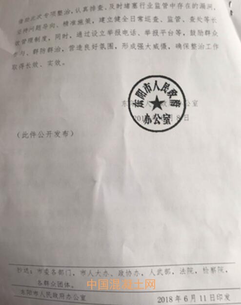 通稿上還明確,自今年來東陽市針對預(yù)拌混凝土供應(yīng)市場存在的問題,從5月開始,政府出臺了《關(guān)于開展違法違規(guī)預(yù)拌混凝土生產(chǎn)項目專項整治工作的通知》(實則2018年6月8日發(fā)布,11日印發(fā)),并組織由東陽市經(jīng)信局(散改辦)牽頭,市公安局、國土局、環(huán)保局、規(guī)劃局、市場監(jiān)管局、安監(jiān)局、建管局、供電公司等部門及鄉(xiāng)鎮(zhèn)(街道)按照各自只能和屬地管理原則,開展聯(lián)合執(zhí)法,依法查處違法違規(guī)預(yù)拌混凝土生產(chǎn)項目。要求6月20日前完成基本整治工作。