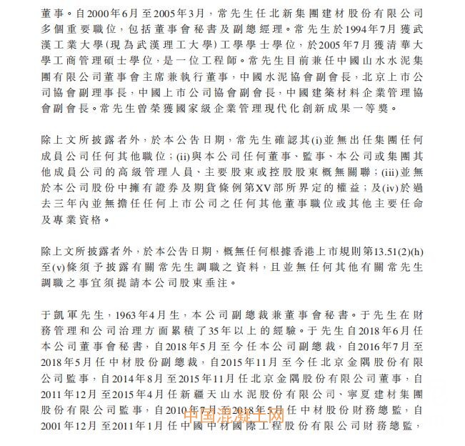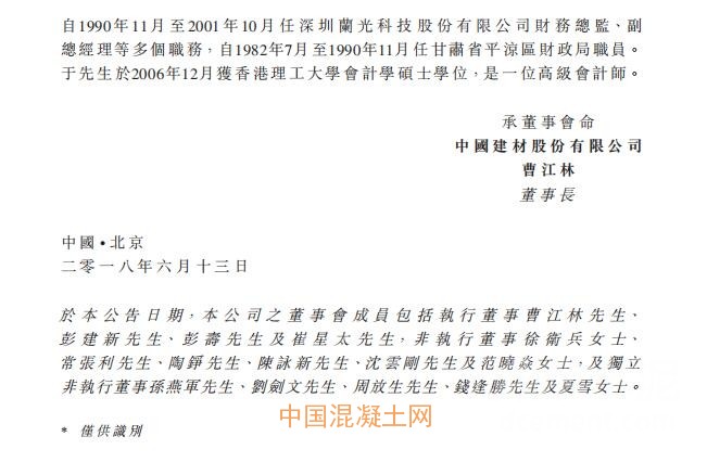 此外,該公司前任總裁曹江林獲委任為該公司董事長;彭建新獲委任為副董事長;前任副總裁彭壽獲委任為總裁;前任執行董事常張利獲調任為非執行董事,及不再擔任該公司董事會秘書及聯席公司秘書;及于凱軍獲委任為該公司董事會秘書,任期自2018年6月13日起生效。