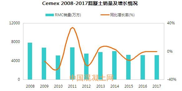 2017年,墨西哥水泥實現(xiàn)凈銷售額228.72億美元,EBITDA(稅息折舊及攤銷前利潤)25.72億美元。其中水泥銷量9200萬噸,混凝土銷量5200萬立方米,骨料銷量1.47億噸,目前集團在全球共有1505個預拌混凝土廠和285個骨料采石場。