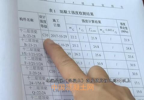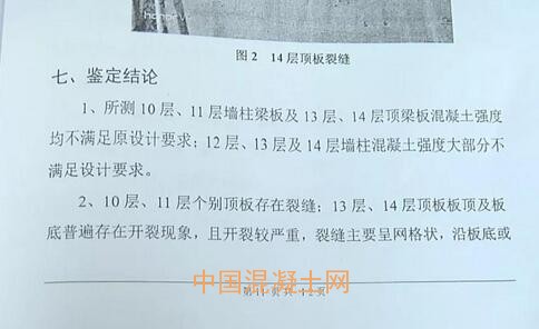 報告上顯示混凝土強度值應達到30以上,但現場檢測只有21.9,確實沒有達到設計強度。鑒定報告也明確寫明了10層到14層的頂梁板和墻柱混凝土強度不滿足設計要求,10層、11層的頂板,13層、14層的頂板和板底存在開裂現象。