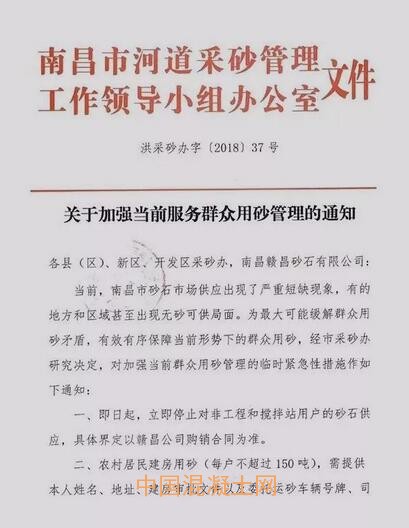 當前,南昌市砂石市場供應出現了嚴重短缺現象,有的地方和區域甚至出現無砂可供局面。為最大可能緩解群眾用砂矛盾,有效有序保障當前形勢下的群眾用砂,經南昌市采砂辦研究決定,對加強當前群眾用砂管理的臨時緊急性措施作如下通知: