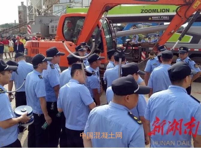 7月5日8時30分,湘陰縣城管局派出綜合執法人員200多人、2臺挖機、 5 臺吊車、1臺鏟車及20余臺運輸車輛的執法隊,來到湘陰縣靜河鄉青湖村附山垸,對湖南湘天混凝土有限公司廠房及辦公用房進行強制拆除。