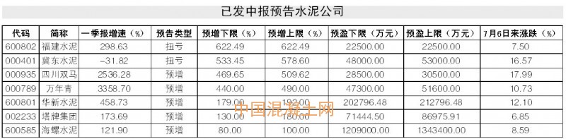 值得注意的是,7月6日,四川雙馬預計上半年業績同比大增469.65%-509.62%,冀東水泥則預告中報扭虧幅度高達533.45%-578.60%,已被機構解讀為超越之前的預期。