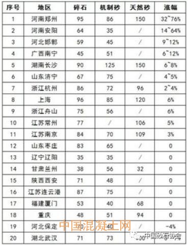 在以上20個地區砂石價格漲幅表中,11個城市砂石價格環比上漲,漲幅高達76%,天然砂報價高達150元/噸。