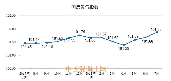 7月份,房地產開發景氣指數(簡稱“國房景氣指數”)為101.88,比6月份提高0.20點。