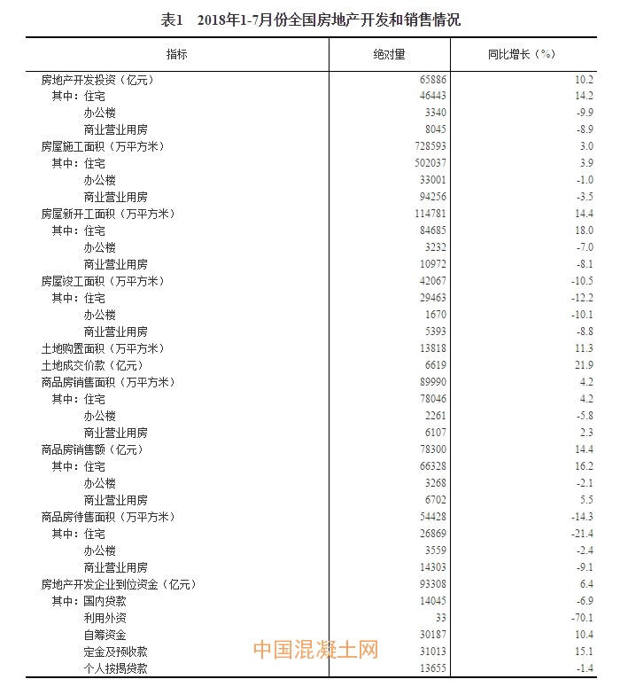 2018年1-7月份,全國房地產開發投資65886億元,同比增長10.2%,增速比1-6月份提高0.5個百分點。其中,住宅投資46443億元,增長14.2%,增速提高0.6個百分點。住宅投資占房地產開發投資的比重為70.5%。