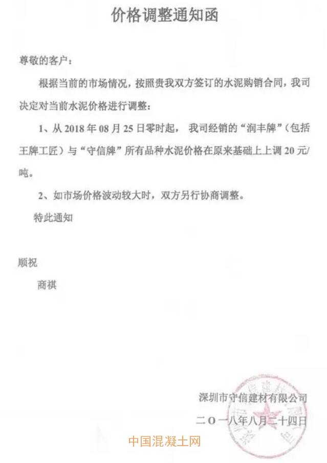 據(jù)小編了解,廣東珠三角部分主流水泥企業(yè)在8月25日起全品種價(jià)格統(tǒng)一上調(diào)20元/噸,涉及區(qū)域包括莞深中區(qū)、廣州中區(qū)、中珠江中區(qū)、佛山區(qū)域、肇慶區(qū)域,具體調(diào)價(jià)函如下: