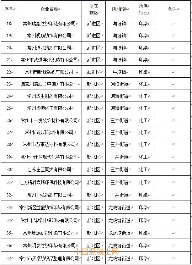 常州市城區范圍內混凝土、化工、印染企業清單