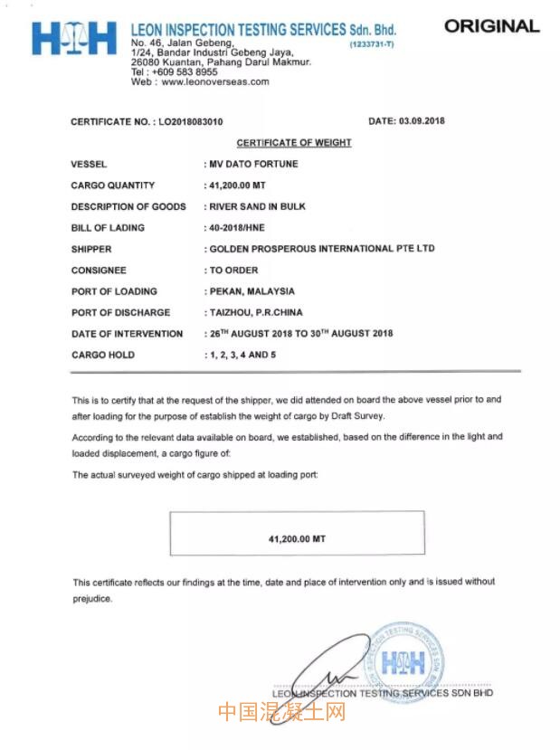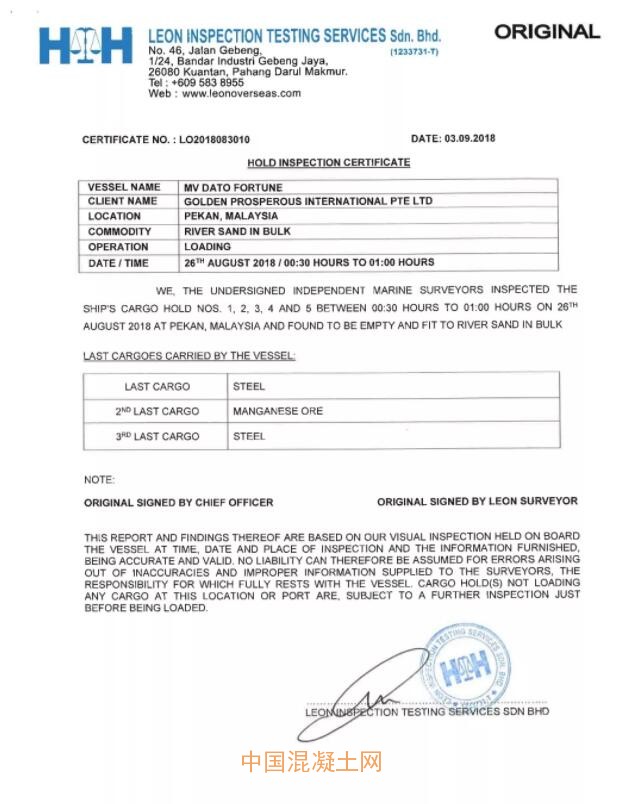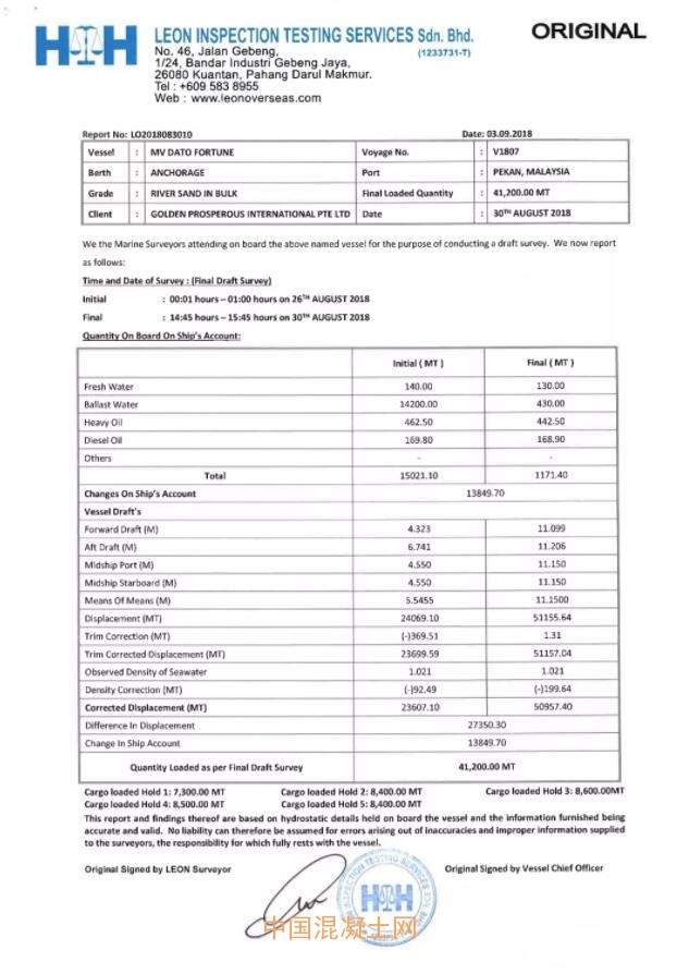 根據馬來西亞LEON INSPECTION TESTING SERVICES Sdn.Bhd.的商檢信息(本船砂的總量為41200噸、氯離子:0.0043%;水分:3.69%、泥含量:0.90%、細度模數:3.00)。