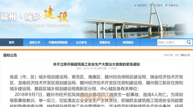 2018年9月7日,贛州市經(jīng)開區(qū)鳳崗鎮(zhèn)創(chuàng)業(yè)路項目工地發(fā)生一起事故,造成4人死亡。為深刻吸取事故教訓,舉一反三,切實落實企業(yè)安全生產(chǎn)主體責任,抓細抓實建筑施工現(xiàn)場安全風險管控和隱患排查治理,持續(xù)提升建筑施工安全管理能力,堅決防范和遏制建筑生產(chǎn)安全事故,經(jīng)研究,決定在全市范圍內立即開展建筑施工安全生產(chǎn)大整治大督查。現(xiàn)就有關工作要求通知如下: