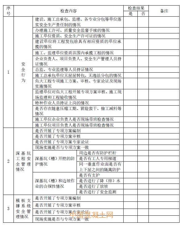 (五)深基坑工程安全管理情況。檢查深基坑(槽)開挖的防護情況,包括周邊防護欄桿、工人專用梯道、同一垂直作業(yè)面上下層之間的隔離防護等;深基坑(槽)和邊坡作業(yè)的合規(guī)性情況,包括支護、降(排)水、放坡、安全監(jiān)測等。