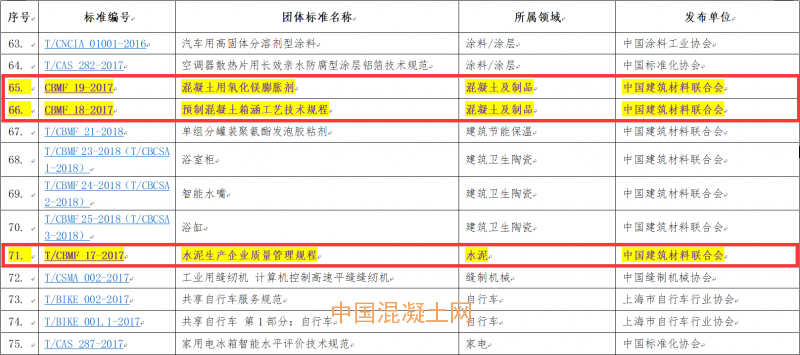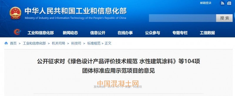 工信部10月19日發布《公開征求對《綠色設計產品評價技術規范 水性建筑涂料》等104項團體標準應用示范項目的意見》,其中《水泥生產企業質量管理規程(T/CBMF 17-2017)》、《混凝土用氧化鎂膨脹劑(CBMF 19-2017)》、《預制混凝土箱涵工藝技術規程(CBMF 18-2017)》等104項團體標準擬列入2018年“百項團體標準應用示范項目”。