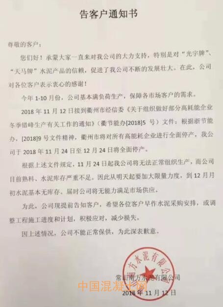 近日,浙江衢州,蘭溪等地水泥廠發布告客戶通知書:當地市政府經信委發布文件《關于組織做好部分高耗能企業冬季錯峰生產有關工作的通知》,根據浙節能辦文件精神,部分城市水泥廠2018年11月24日—12月24日將全面停產。