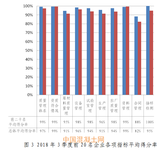 三季度預拌混凝土企業質量管理體系、資質符合情況、設備管理、資料管理和抽樣檢測等方面較好,得分率均在95%以上;原材料質量管理較二季度下降2個百分點,應引起重視;合同管理和抽樣檢測得分率較二季度均提高2個百分點。從整體來看,各指標體系平均得分率差距正在逐步縮小。具體情況見圖2。