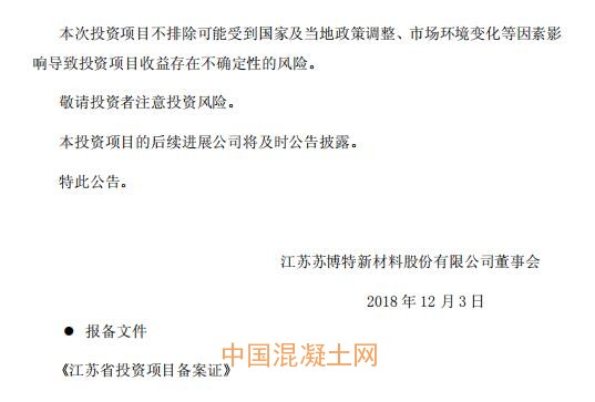12月3日晚間,蘇博特(603916)發(fā)布公告稱(chēng),為進(jìn)一步提升公司制造工藝,提高公司高性能混凝土的生產(chǎn)供應(yīng)能力,公司子公司博特新材料泰州有限公司擬在江蘇省泰興市投資建設(shè)年產(chǎn)62萬(wàn)噸高性能混凝土外加劑建設(shè)項(xiàng)目,投資金額為1.38億元。主要建設(shè)內(nèi)容包括年產(chǎn)10萬(wàn)噸聚醚、50萬(wàn)噸聚羧酸減水劑、1.5萬(wàn)噸丙烯酸羥基酯、0.5萬(wàn)噸液體烯醇鈉。