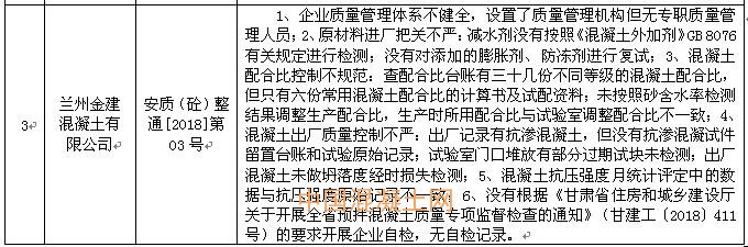 省住建廳對督查組下發整改通知單的平涼陽光建工混凝土有限責任公司、甘肅西部建材有限責任公司、蘭州金建混凝土有限公司三家企業,給予全省通報批評。對于三家企業存在的問題,相關市建設行政主管部門均督促企業進行了整改,并向督查組報送了書面整改報告,其中平涼市對企業負責人進行了約談,蘭州市將甘肅西部建材有限責任公司列入黑榜進行公布,對相關企業加大了監管力度。