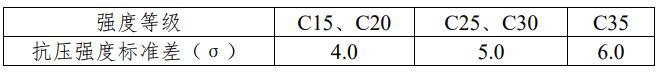 再生骨料混凝土抗壓強度標準差應根據同品種、同強度等級的再生骨料混凝土統計資料計算確定。計算時,強度試件組數不應少于25組;當無統計資料時,其抗壓強度標準差宜按下表取值: