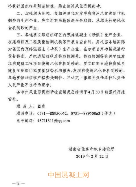 《通知》要求,各市州住建局和各相關單位要進一步提高對建筑用砂質量管理重要性的認識。建筑工程使用風化巖機制砂,直接危及建筑工程質量安全,各級住房城鄉建設主管部門、監督機構及工程項目各責任主體單位(建設、監理、施工企業、預拌混凝土(砂漿)生產企業、工程質量檢測機構等)要充分認識到建筑工程使用風化巖機制砂的危害性,嚴格執行國家相關規范標準,禁止使用風化巖機制砂。