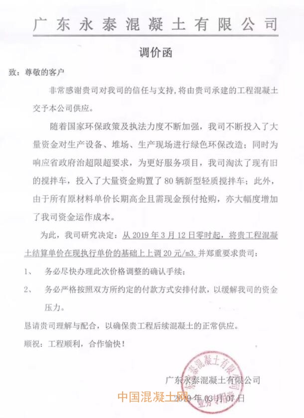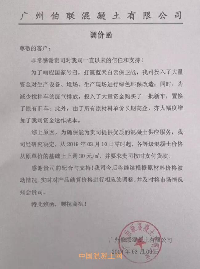 廣州伯聯混凝土有限公司調價函稱,為了響應國家號召,打贏藍天白云保衛戰,公司投入了大量資金對生產設備、堆場、生產現場進行綠色環保改造;同時,為減少攪拌車的廢氣排放,投入了大量資金購買了一批新車,置換了原有舊車;此外,由于所有原材料單價長期高企,亦大幅增加了公司資金運作成本。