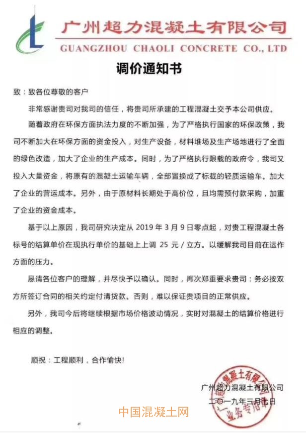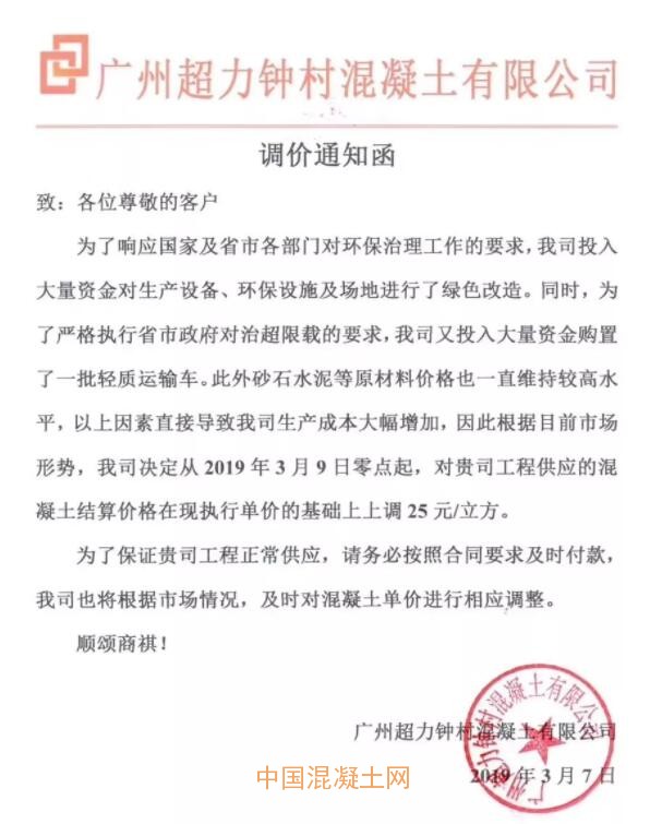 廣州超力鐘村混凝土有限公司調價通知,從3月9日零點起,上調25元/立方米。