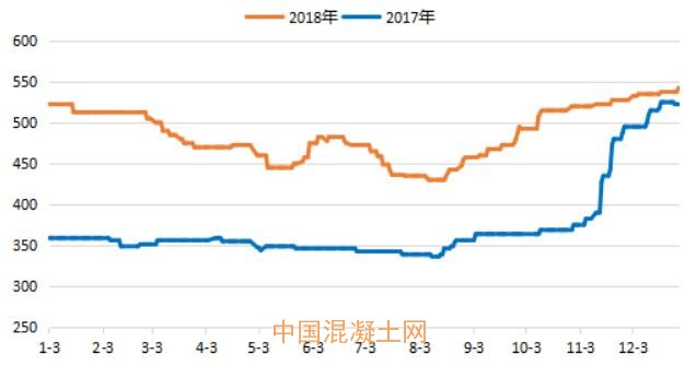 一、17年到18年山東省PO42.5散裝水泥平均價格走勢圖