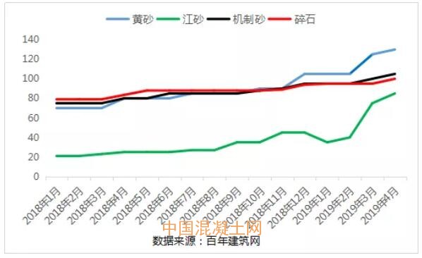 實地考察中,我們發現各攪拌站倉庫中原材料儲備普遍偏低,其中砂料短缺情況尤為嚴重。L攪拌站工作人員D先生反映:“這段時間,我們當地的工程集中開工,我們的訂單根本忙不過來。你們再看看江砂,價格翻了一番,還很難買!我們站的產能只能發揮三成,根本不能保供,現在我都是挑付現款的公司優先供應。”