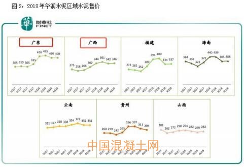 從直觀的角度上看,公司營(yíng)業(yè)收入增速明顯弱于歸屬股東凈利潤(rùn)年復(fù)合增速,這主要受期間內(nèi)公司增強(qiáng)了對(duì)成本管控(運(yùn)營(yíng)管理、采購(gòu)管理及物流管理)及水泥價(jià)格上漲所致。特別是2018年,公司的歸屬股東凈利潤(rùn)是上市至今表現(xiàn)最佳的一年。其中最大影響因素莫過(guò)于兩廣水泥價(jià)格維持高位,且價(jià)格普遍高于國(guó)內(nèi)其他地區(qū)(如下圖2所示)。