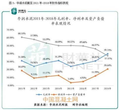 截至2018年底,公司毛利率從2011年的31.08%增至2018年的39.75%。其中毛利率從2015年低點(diǎn)的23.96%增長(zhǎng)15.79個(gè)百分點(diǎn)至2018年的39.75%,主要是受期間內(nèi)公司增強(qiáng)成本、資本開(kāi)支的管控,同時(shí)期間內(nèi)水泥價(jià)格走高等因素影響,推動(dòng)公司毛利率從2015年的53.76億元增至2018年的135.11億元,年復(fù)合增速高達(dá)35.95%。