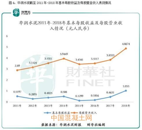 凈利率的增長(zhǎng)也推動(dòng)了公司基本每股收益及每股營(yíng)收入持續(xù)走強(qiáng)(圖4)。截至2018年底,華潤(rùn)水泥的基本每股收益從2011年的0.519元增至2018年的1.033元,同期每股營(yíng)業(yè)收入從2.89元增至4.867元。