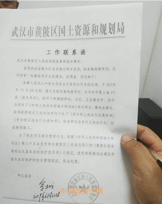 黃陂區國土資源和規劃局執法監察大隊負責處理此事的一位孫隊長介紹,他們在接到村民反映的情況后,已多次到現場調查處理。經查,目前攪拌站建筑占地約11畝,擬占地約47畝。2018年11月2日,國土執法部門向八葉堂公司下達了《責令停止違法行為通知書》,責令其立即停止違法行為。2018年11月5日,國土執法部門向八葉堂下達了《責令改正違法行為通知書》,限其七日內自行清空場地、恢復土地原狀。2018年12月1日,國土部門以書面形式向姚家集街道辦下來聯系函,建議街道辦對以上違法行為進行查處,制止其違法行為。2019年1月7日,國土執法部門再次到現場,下達了《責令停止違法行為通知書》,責令其立即停工。