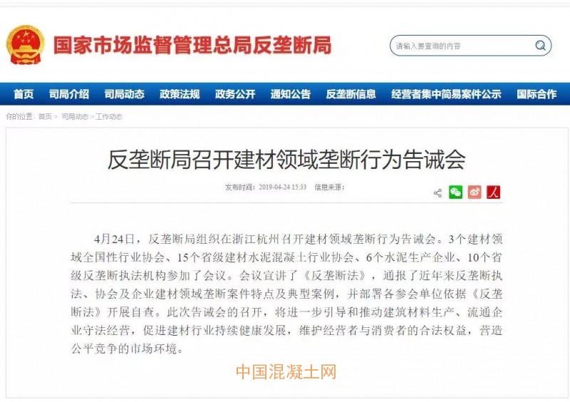 昨日(4月24日)國家市場監(jiān)督管理總局反壟斷局發(fā)布《反壟斷局召開建材領(lǐng)域壟斷行為告誡會》的消息稱:反壟斷局組織在浙江杭州召開建材領(lǐng)域壟斷行為告誡會。3個建材領(lǐng)域全國性行業(yè)協(xié)會、15個省級建材水泥混凝土行業(yè)協(xié)會、6個水泥生產(chǎn)企業(yè)(中國建材、海螺水泥、冀東水泥、華潤水泥、華新水泥、山水水泥公司)、10個省級反壟斷執(zhí)法機構(gòu)參加了會議。