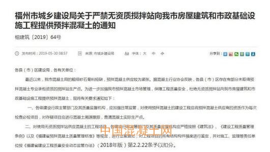福州市城鄉建設局2019年5月30日發布《關于嚴禁無資質攪拌站向我市房屋建筑和市政基礎設施工程提供預拌混凝土的通知》 。近期以來,福州市混凝土用的粗細砂石骨料短缺,導致預拌混凝土供應較為緊張。據混凝土行業協會反映,各縣(市)區存在部分未取得預拌混凝土專業承包資質的攪拌站生產點。