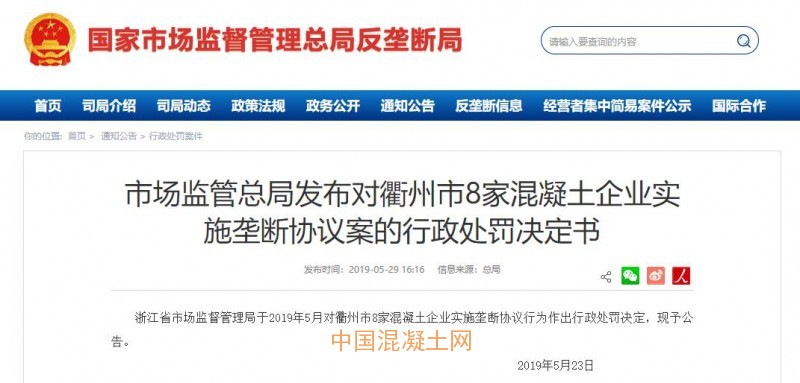 浙江省市場監督管理局于2019年5月對衢州市8家混凝土企業實施壟斷協議行為作出行政處罰決定,現予公告。