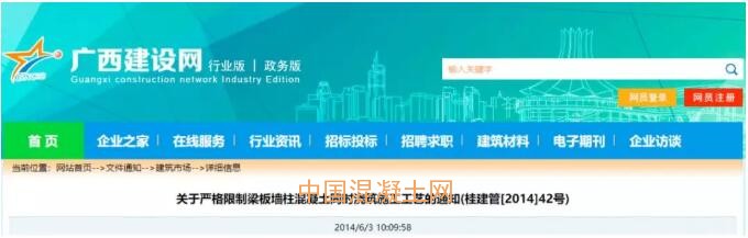 早在2014年,廣西住房城鄉建設廳就下發了《關于嚴格限制梁板墻柱混凝土同時澆筑施工工藝的通知》(桂建管[2014]42號),文件指出: