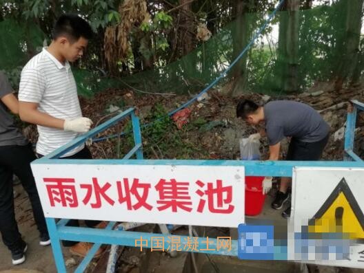 ▲監(jiān)測工作人員對東莞市創(chuàng)基混凝土有限公司雨水下水道外排廢水采樣
