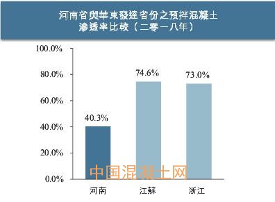 根據2017年出臺的《關于預拌混凝土行業淘汰落后與轉型升級指導意見》,現場混凝土生產等落后及不環保的生產方法在未來將逐步淘汰。而在2018年河南省內預拌混凝土滲透率僅為40.3%,不及全國平均值46.2%,更是遠低于華東發達省份的70%。據預計,河南預拌混凝土市場將持續整合并在2023年達到44.9%的滲透率。