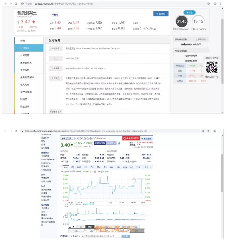 在今年3月29日,新奧混凝土漲28%,在中概股中居前列 (http://finance.ifeng.com/c/7lQjGvyRu3U);22號,新奧混凝土盤中異動,又大幅拉升5.83%(https://finance.sina.cn/stock/relnews/us/2019-06-22/detail-ihytcerk8500249.d.html?vt=4&pos=102)。
