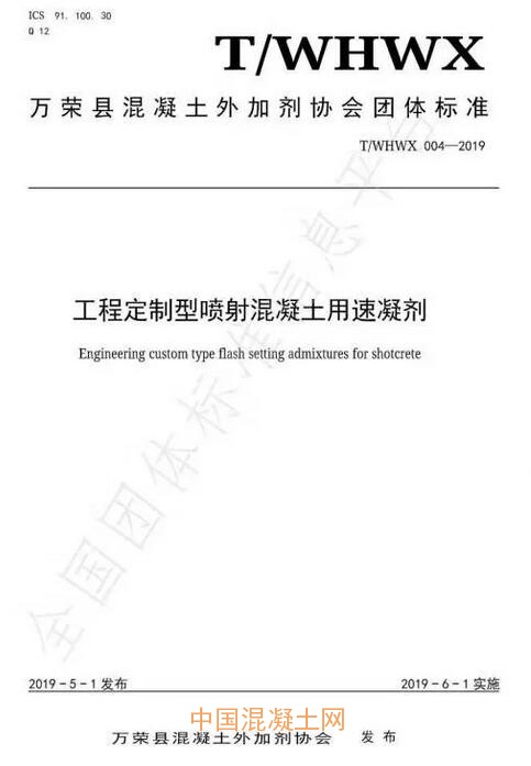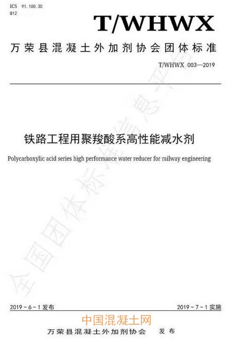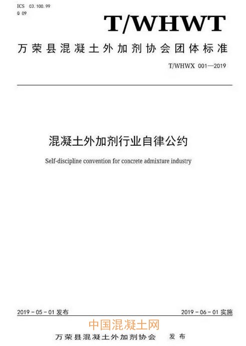 2019年7月16日,萬榮縣混凝土外加劑協會發布公告“關于批準發布《混凝土外加劑行業自律公約》等三項團體標準的公告”(2019年05號),由萬榮縣混凝土外加劑協會標準部和山西黃騰化工有限公司主編的團體標準T/WHWX 001-2019《混凝土外加劑行業自律公約》、由山西省混凝土外加劑產品質量監督檢驗中心和山西鐵力建材有限公司主編的團體標準T/WHWX 003-2019《鐵路工程用聚羧酸系高性能減水劑》、由山西省混凝土外加劑產品質量監督檢驗中心和山西凱迪建材有限公司主編的團體標準T/WHWX 004-2019《工程定制型噴射混凝土用速凝劑》將于2019年9月1日起實施。