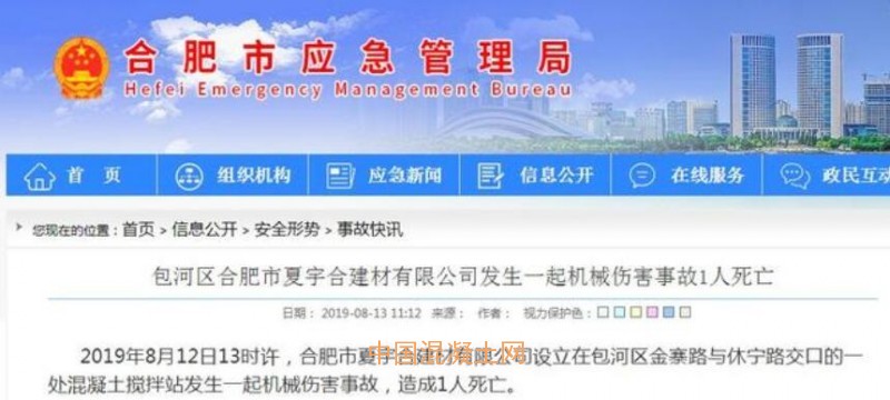 據合肥市應急管理局官網消息,2019年8月12日13時許,合肥市夏宇合建材有限公司設立在包河區金寨路與休寧路交口的一處混凝土攪拌站發生一起機械傷害事故,造成1人死亡。