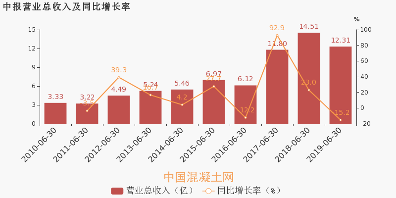 從業務結構來看,“商品混凝土”是企業營業收入的主要來源。具體而言,“商品混凝土”營業收入為5.4億,營收占比為43.8%,毛利率為19.6%。