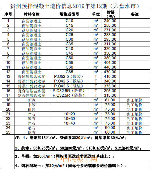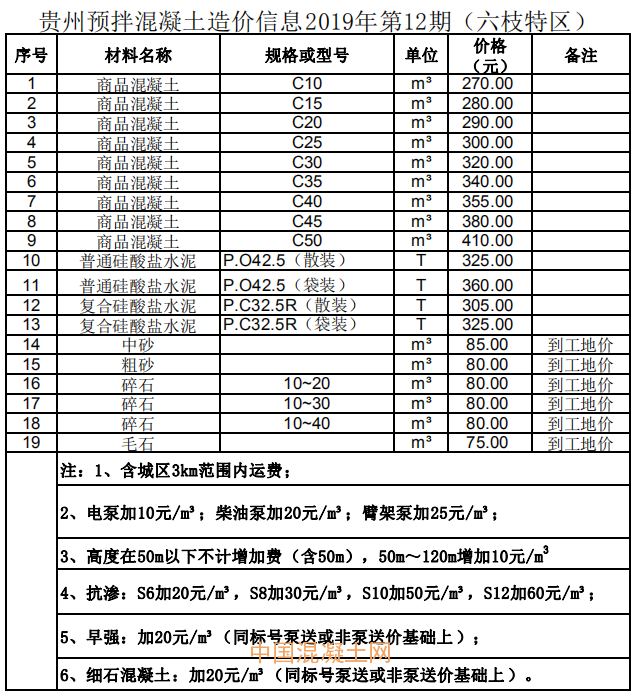 1月9日,貴州省預拌混凝土行業協會發布了貴州省預拌混凝土造價信息2019年第12期。造價信息顯示,商品混凝土平均價格高于干拌商品砂漿、硅酸鹽水泥等其他預拌混凝土。其中,銅仁市商品混凝土C60與六盤水市商品混凝土c60價格最高,為470元/m3,比第11期最高價格降低10元;黔南州毛石價格最低,且與第10期、第11期價格持平,為55元/m3。