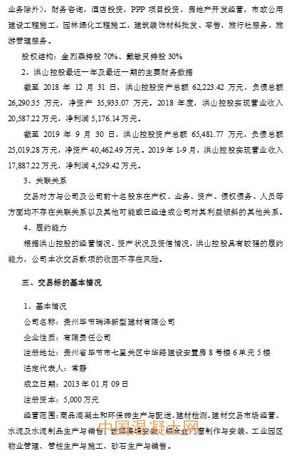 公告顯示,貴州畢節瑞澤新型建材有限公司經營范圍為:商品混凝土和環保磚生產與配送、建材檢測、建材交易市場經營、水泥及水泥制品生產與銷售;玻璃幕墻安裝、鋁合金門窗制作與安裝、工業園區物業管理、管樁生產與施工、砂石生產與銷售。