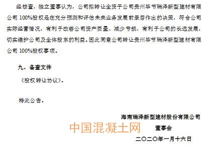 2020年1月15日,海南瑞澤新型建材股份有限公司(以下簡稱“公司”)與貴州洪山投資控股有限公司(以下簡稱“洪山控股”)簽訂了《股權轉讓協議》。公告稱鑒于公司全資子公司貴州畢節瑞澤新型建材有限公司(以下簡稱“畢節瑞澤”或“標的公司”)一直處于虧損狀態,為了更好地改善資產流動性、盤活存量資產、發揮資產效益,公司將持有的畢節瑞澤100%的股權轉讓給洪山控股,轉讓價格為人民幣3100萬元。