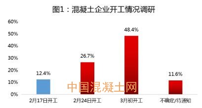 截至2月20日,對全國25個省級行政區的近500家混凝土企業的開工情況、計劃開工日期、以及開市后價格走勢預判做了調研。其中數據顯示(見圖1),2月17日混凝土企業開工率占調研樣本的12.4%;預計24日開工的占比為26.7%;預計3月初開工的企業占比48.4%,此外疫情相對嚴重的地區混凝土企業難以預判開工日期的占樣本企業的11.6%。接近一半的混凝土企業認為復產日期將在3月初左右。從調研的情況來看更多的企業認為3月初開工的可能性較大,其主要原因在于疫情方面得到一定的控制,且預計3月份道路封航會有一定的緩解,因此混凝土配送壓力將會降低。