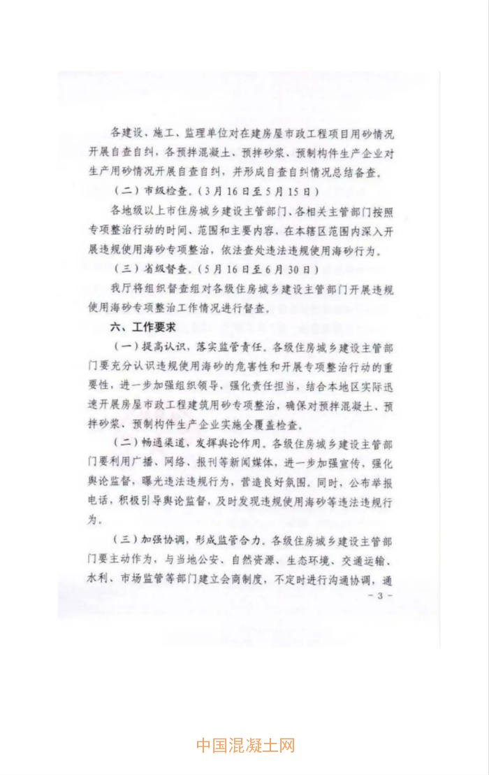 4、依法從嚴查處違法違規使用海砂行為。對抽查發現的氯離子含量、貝殼含量、混凝土氯離子含量超出規定值的,要立即責令相關項目停工整改、相關生產企業停業整頓,并對可能涉及到的其他項目進行全面排查,追溯相應批次預拌混凝土去向,妥善處理;存在違法違規行為的,要依法嚴肅查處。