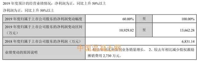 在2019年第三季度季報中,紅墻股份預計2019年歸屬于上市公司股東的凈利潤變動區間為1.09億元至1.37億元,同比增長60%至100%。2018年該公司歸屬于上市公司股東的凈利潤為6831.14萬元。業績變動原因是外加劑業務銷量增和減少股權激勵攤銷費用 2730 萬元。