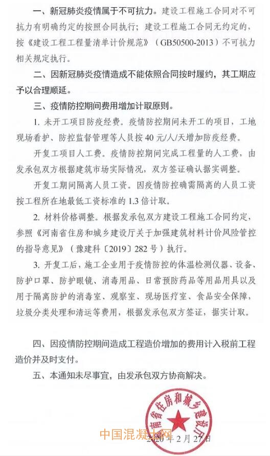 (二)受疫情影響推遲開(復)工項目。已完成招投標推遲開工(計劃開工時間在疫情防控期間)及結轉推遲復工項目,承發包雙方應就工期、人材機價格調整及新冠肺炎疫情防控專項費用等內容及時簽訂補充合同。