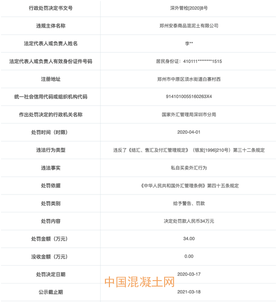 國家外匯管理局網站近日公布的行政處罰決定書(深外管檢[2020]8號)顯示,鄭州安泰商品混凝土有限公司存在私自買賣外匯行為。依據《中華人民共和國外匯管理條例》第四十五條規定,國家外匯管理局深圳市分局決定給予其警告,并處罰款人民幣34萬元。