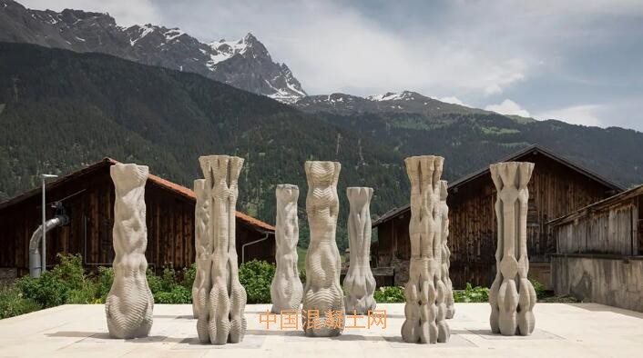 近期,該機構還展示了3D打印混凝土的發展潛力,瑞士Riom的“Concrete Choreography”裝置展示了第一個3D打印混凝土舞臺,其中包含有無模板支柱。該裝置由瑞士Riom的Origen Festival合作完成,有著9根高度為2.7米的支柱,這些支柱通過定制的軟件來進行設計,并應用蘇黎世理工學院開發的機器3D打印過程進行制作。打印出的空心混凝土結構使得材料的策略性更強,同時也滿足了混凝土建筑的可持續發展。另外,經過計算設計的材料裝飾和表面肌理都展示了3D混凝土打印技術在大型建筑中的多功能特征和美學潛力。